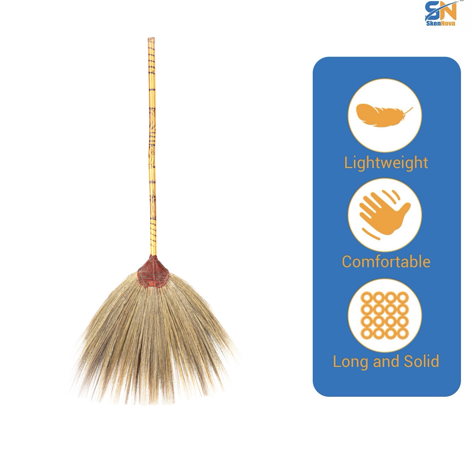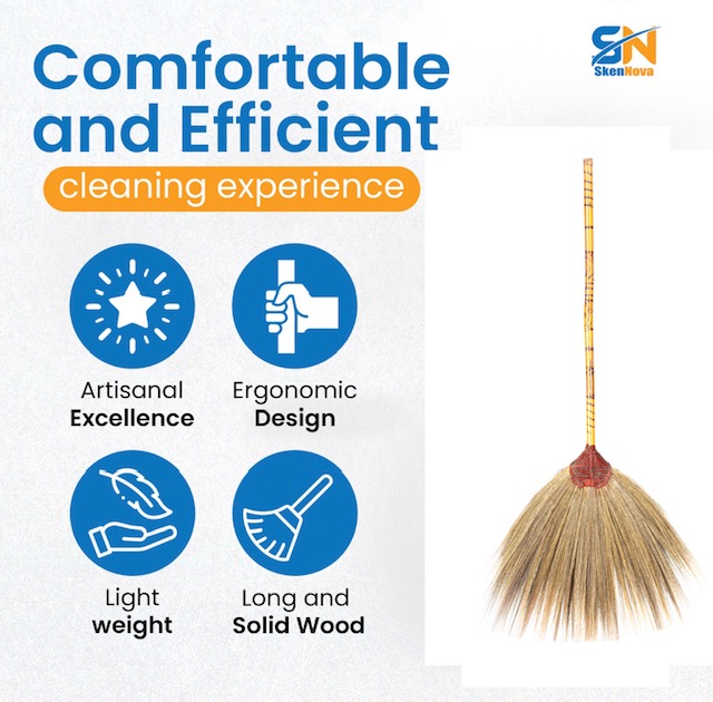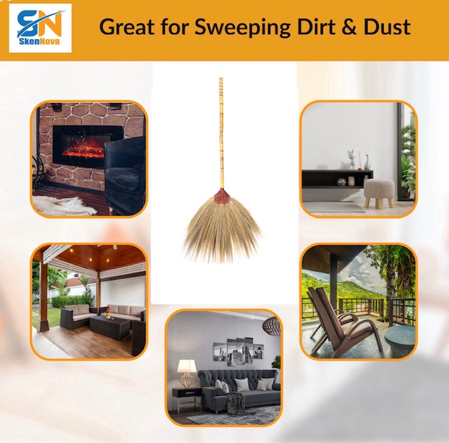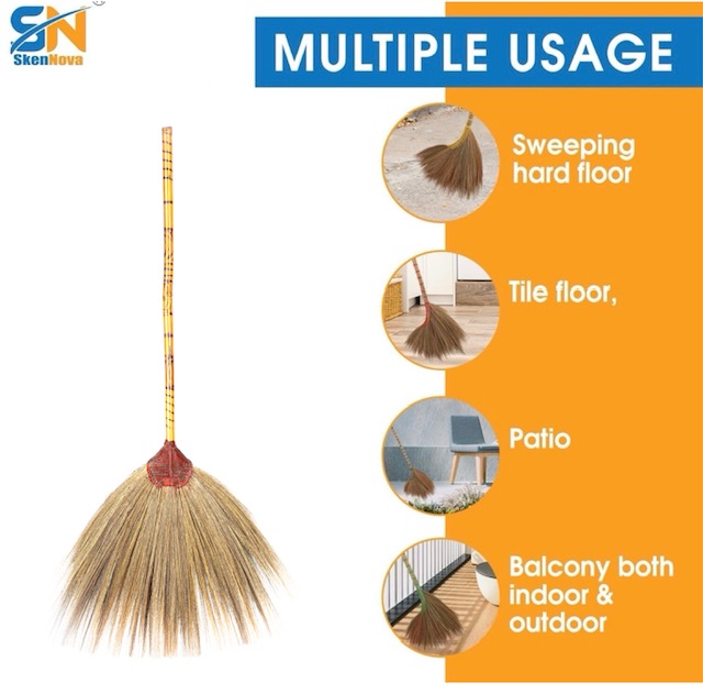 The broom features natural grass fibers, meticulously bound together and attached to a sturdy bamboo handle. It is perfect for sweeping both indoor and outdoor spaces, thanks to its lightweight yet durable design. The 40-inch length offers a comfortable grip, making it easy to clean large areas with minimal effort.