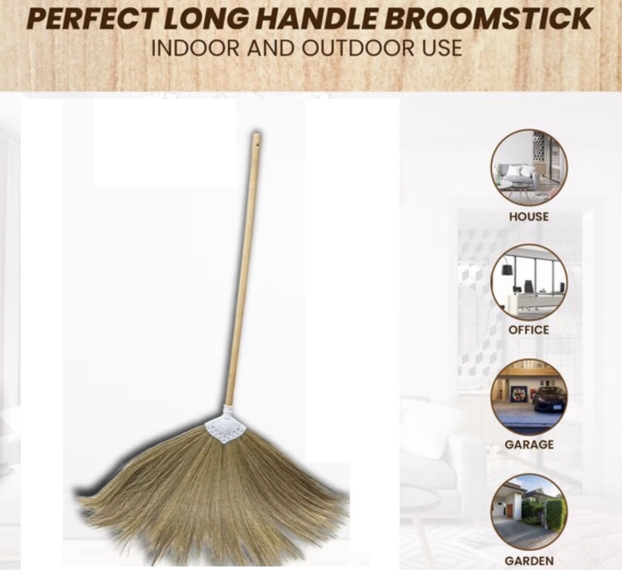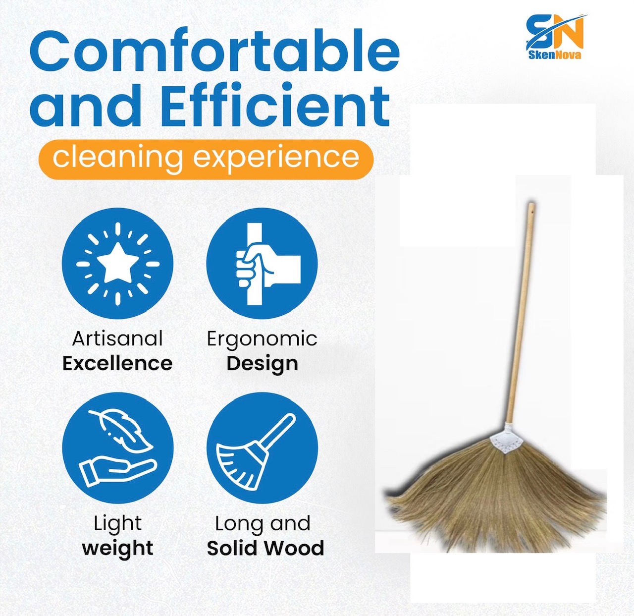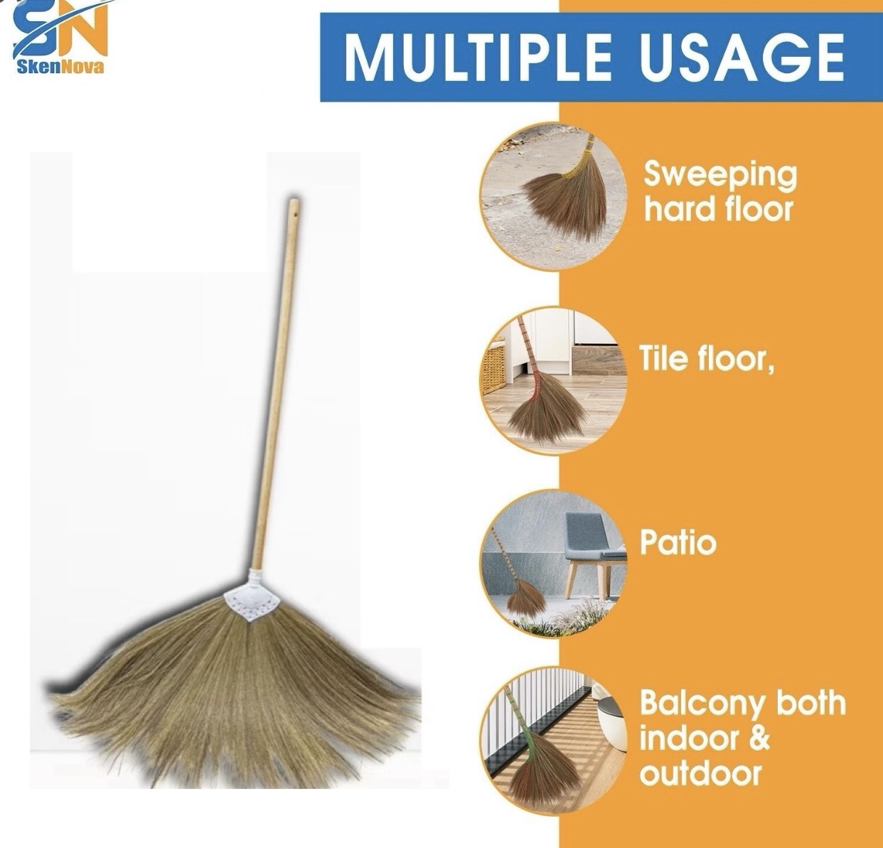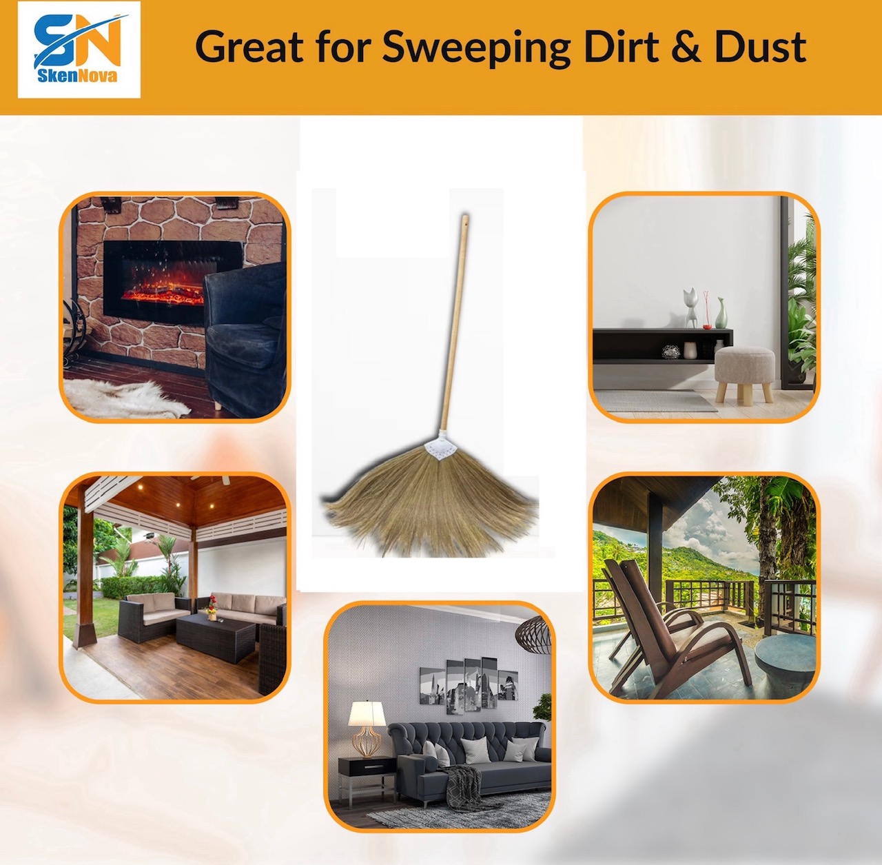 • Natural Materials: Made from Kong grass, known for its durability and effective sweeping capabilities, and a solid wood handle that provides a comfortable grip.