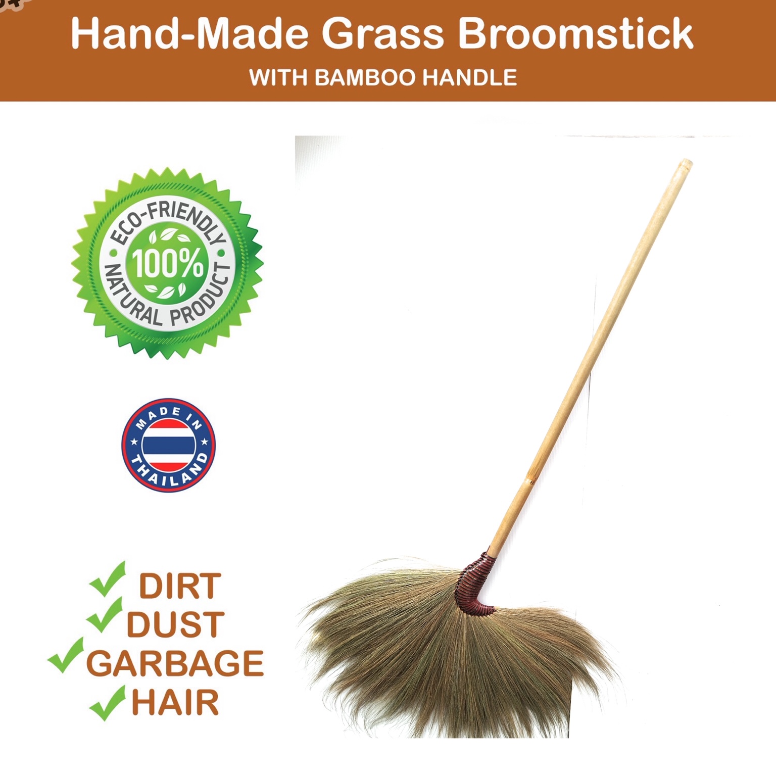 Experience the timeless artistry of Thai craftsmanship with our Authentic Thai Grass Broom, exclusively available on Amazon. Handmade with care, this broom features a sturdy 40-inch bamboo handle paired with a generous 20-inch sweeping width, offering efficient and thorough cleaning.